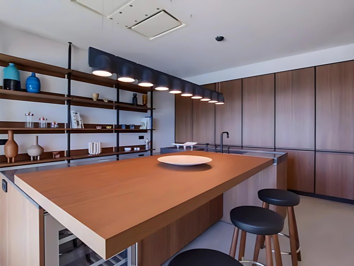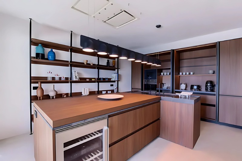 Los gabinetes de cocina se presentan principalmente en madera de nogal, aportando una calidez serena y refinada que transforma el ambiente en un espacio acogedor. El conjunto se corona con una encimera de piedra natural en granito negro, que aporta fuerza visual, resistencia y contraste.